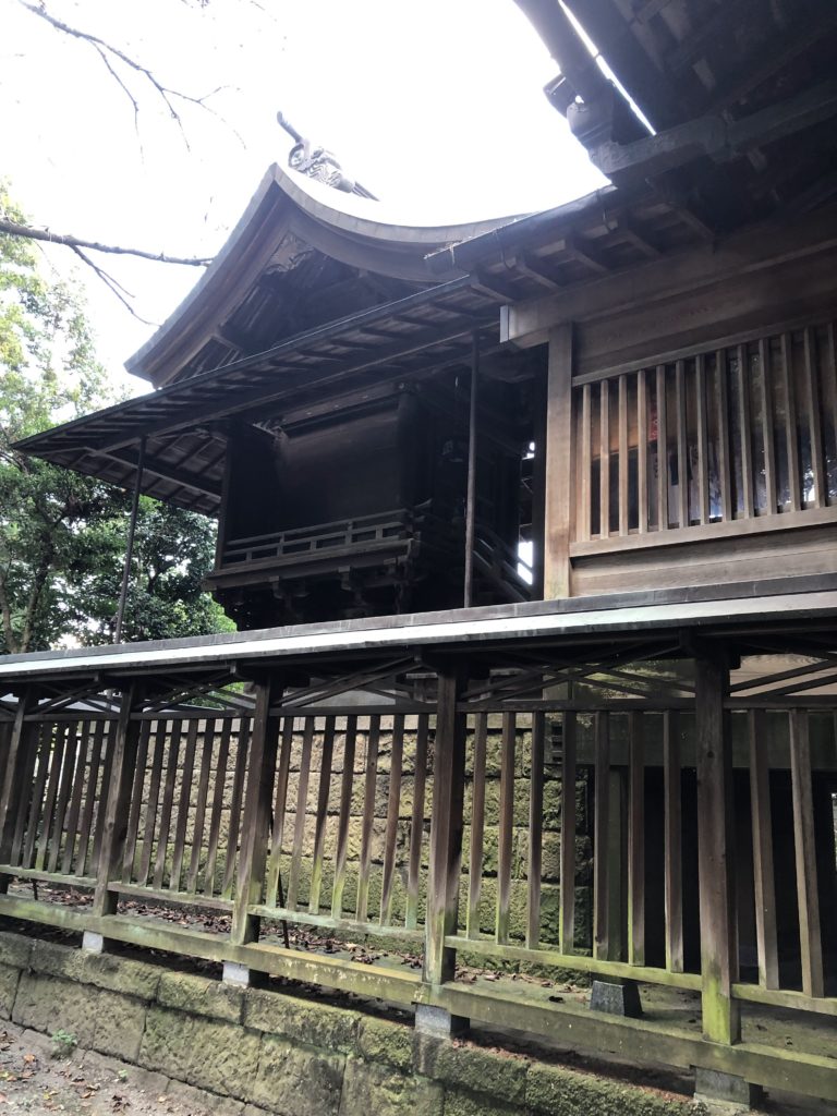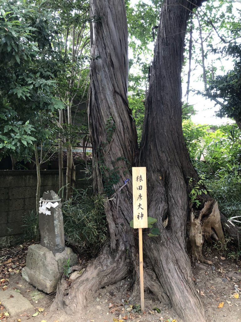 趣深い佇まいの末社、猿田彦大神ゆかりの御神木