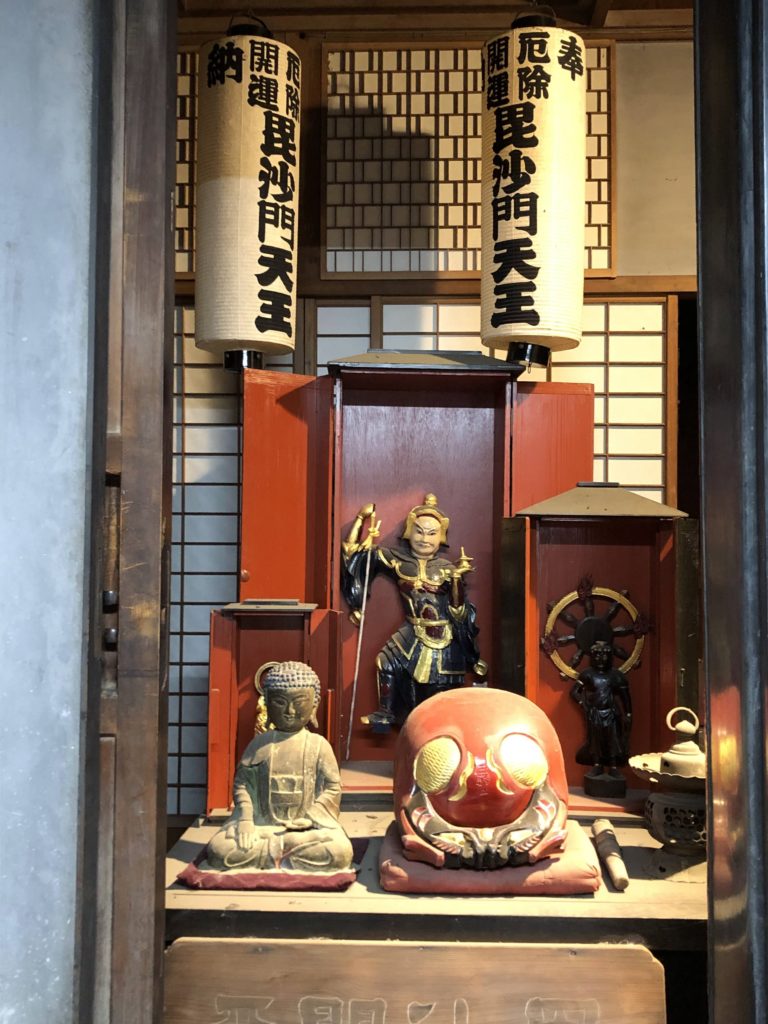 七福神の一人としても古来日本人に親しまれてきた神様で、勝負運を上昇させると信仰を集めてきました。入館してすぐ、おばあさんと猫のハイテクロボットがあるお部屋の裏手、文庫蔵にある厨子の中にまつられています。